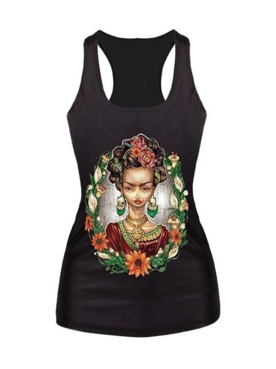 Women Cult Frida Digital Print Tank Top Clubwear Gothic Punk T-Shirt(Black)
